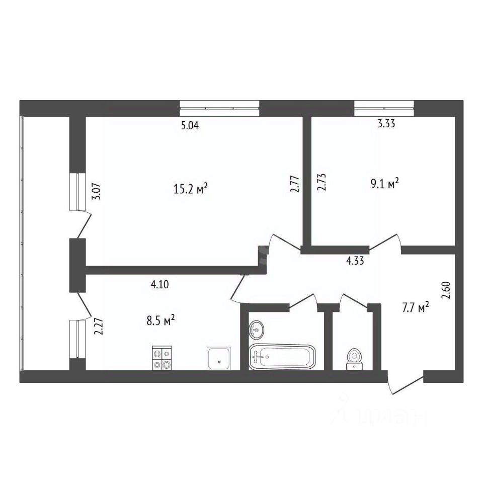 Квартира площадью 43,3 кв. м. предлагает вам две раздельные комнаты (15,2 кв. м. и 9,1 кв. м.), просторную кухню (8,5 кв. м.), а также удобный коридор и раздельный санузел. Большая лоджия. Окна ПВХ обеспечивают отличную тепло- и звукоизоляцию, а на полу уложен ламинат.