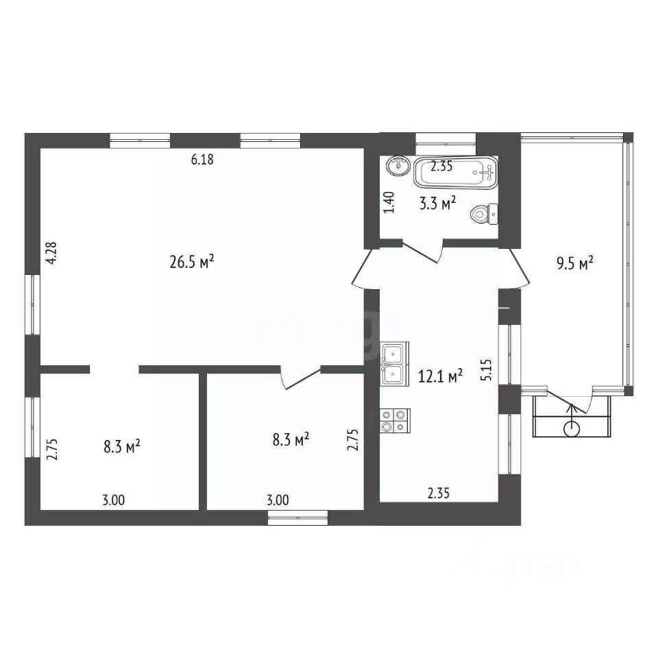 Внутри выполнен ремонт: три комнаты (8,3 кв. м, 8,3 кв.м и 12,1 кв. м), просторная кухня 12 кв. м с современным гарнитуром, совмещенный санузел и удобная терраса площадью 9 кв. м.