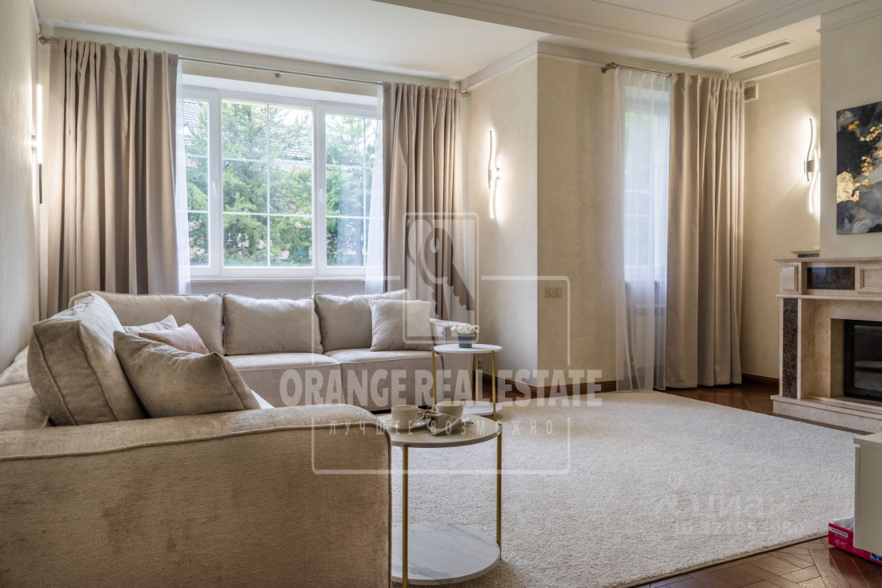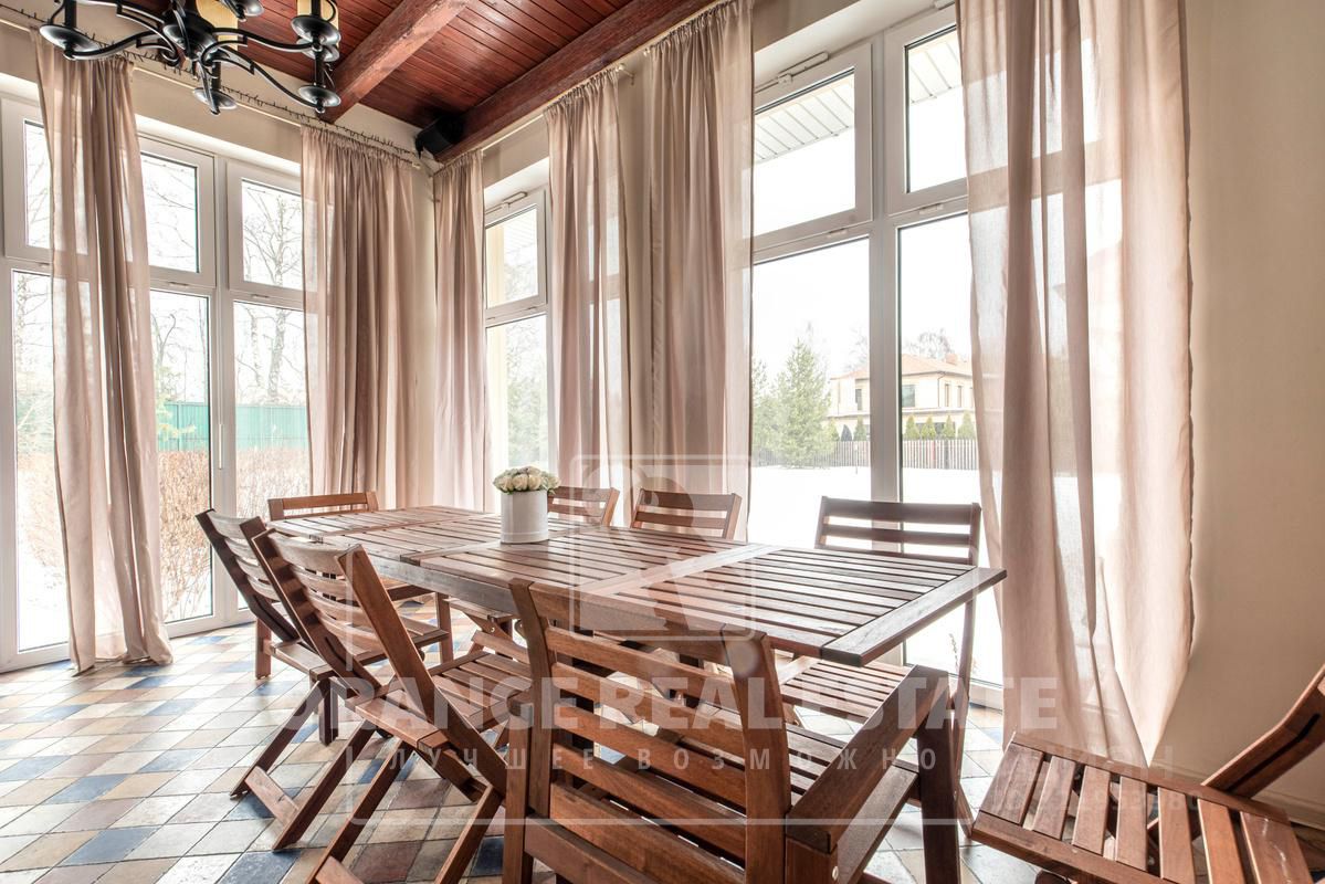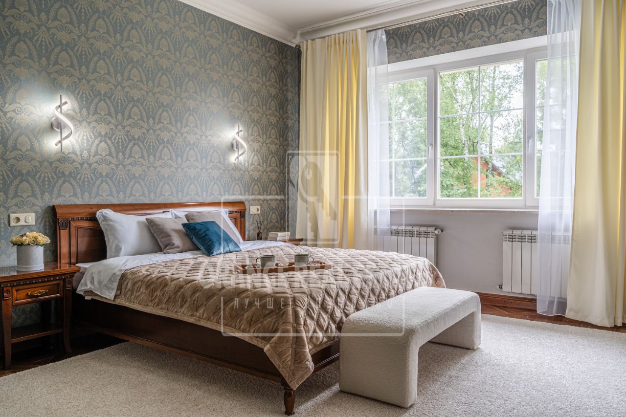 Дизайн коттеджа выполнен в стиле строгой классики, дом полностью обставлен мебелью и укомплектован всей необходимой техникой: кухонный гарнитур с техникой Kuppersbush, стиральная машина Bosh, винный шкаф Liebherr, стиральная машина Bosh, спальные гарнитуры и диваны (Италия), ковры (Бельгия).